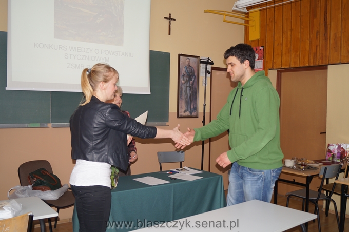 Uczniowie ZSMiR Piątku doskonale poradzili sobie z trudnymi pytaniami. I miejsce zajęła Błaszczyk Kinga, która uzyskała 23 punkty. Tuż za Kingą z ilością 22 punktów II miejsce zajął Kołodziejski Bartłomiej. Na trzecim miejscu znalazła się Patrycja Czerwińska.  Uczniów do konkursu zgłosił i przygotował mgr Jacek Walczak. Konkurs w ZSMiR w Piątku przeprowadziła Barbara Sobińska, która wręczyła Pani Urbanek Lucynie - dyrektor szkoły uchwalę Senatu ustanawiającą rok 2013 rokiem Powstania Styczniowego, podpisaną przez Marszałka Senatu Bogdana Borusewicza. Pani dyrektor Urbanek uczestniczyła również w najprzyjemniejszym momencie konkursu -  wręczaniu nagród i dyplomów. Dziękujemy Dyrekcji oraz Nauczycielom za pomoc w organizacji konkursu oraz za miłe przyjęcie.