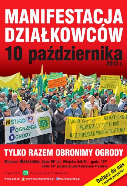 „Tylko razem obronimy ogrody działkowe” - pod takim hasłem odbyła się w Warszawie ogólnopolska manifestacja działkowców. W czwartek, 10 października przed budyniem Sejmu zebrały się grupy działkowców z całej Polski. Manifestującym poparcia udzielił senator RP Przemysław Błaszczyk, który spotkał się z przedstawicielami działkowców z Uniejowa. Na proteście byli również działkowcy z Łowicza.