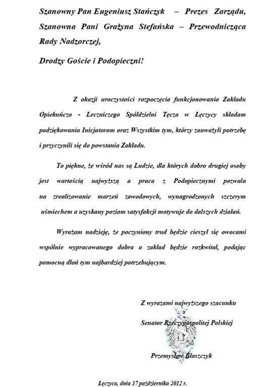 Przewodnicząca Rady Nadzorczej Spółdzielni Inwalidów Tęcza Pani Grażyna Stefańska oraz Prezes Zarządu Pan Eugeniusz Stańczyk zaprosili senatora Przemysława Błaszczyka na uroczyste otwarcie Zakładu Opiekuńczo - Leczniczego Spółdzielni Inwalidów Tęcza Z.P. Ch. w Łęczycy.