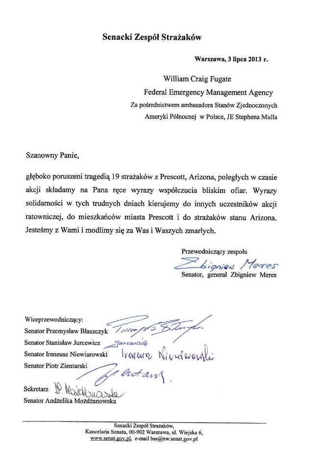 Senacki Zespół Strażaków, którego członkiem jest senator Przemysław Błaszczyk złożył za pośrednictwem ambasadora Stanów Zjednoczonych Amerki Północnej wyrazy współczucia bliskim ofiar tragedii z Prescott, Arizona.