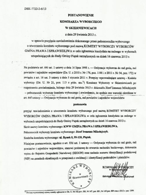 Wybory uzupełniające do Rady Gminy Piątek - Informacja o rejestracji Komitetu Wyborczego Wyborców Gmina Prawa i Sprawiedliwa