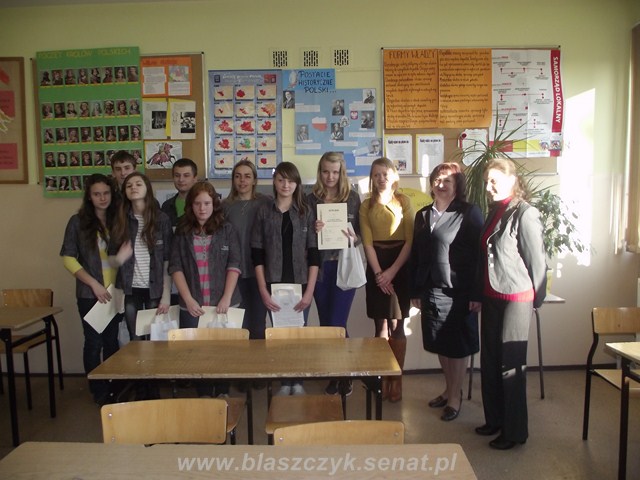 Laureatom serdecznie gratuluje senator Przemysław Błaszczyk, który zwycięzców I miejsca pozna osobiście na wspólnym wyjeździe do Warszawy w roku 2013.  Słowa podziękowania skierowane są do Dyrekcji za pomoc w zorganizowaniu konkursu oraz do pań nauczycielek -  opiekunek uczestników konkursu: do Pani Alicji Rojewskiej oraz Pani Patrycji Staniszewskiej.